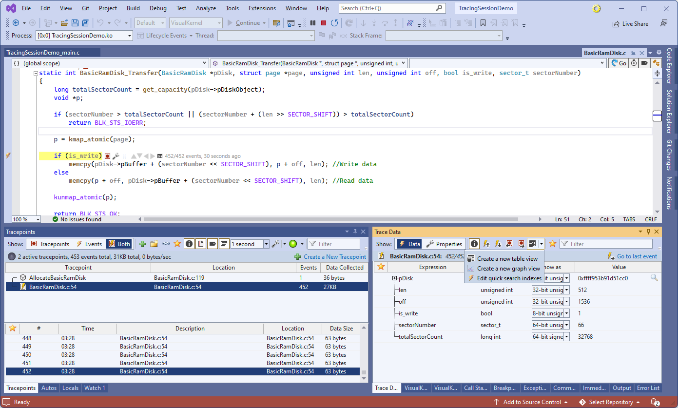 Note that unlike breakpoints, that stop the target, tracepoints immediately capture the selected data in an internal memory buffer, and resume it. Hence, tracepoints do not interfere with the regular kernel operation, and do not require any special debugging setup other than a regulra network connection. - Now we will set another tracepoint using the tracepoint bar. Hover the mouse to the left of the is_write check in BasicRamDisk_Transfer() until you see the gray lightning icon. Click on it to begin creating a tracepoint: