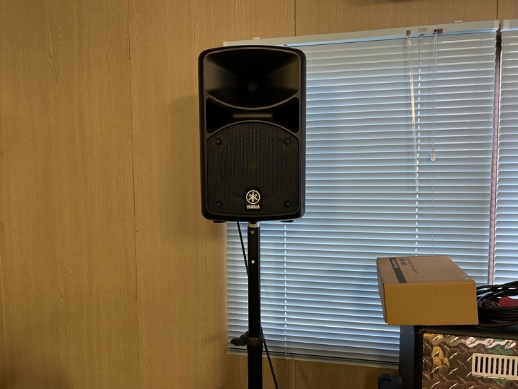 秘密基地スタジオのPAスピーカーとコーラスマイク