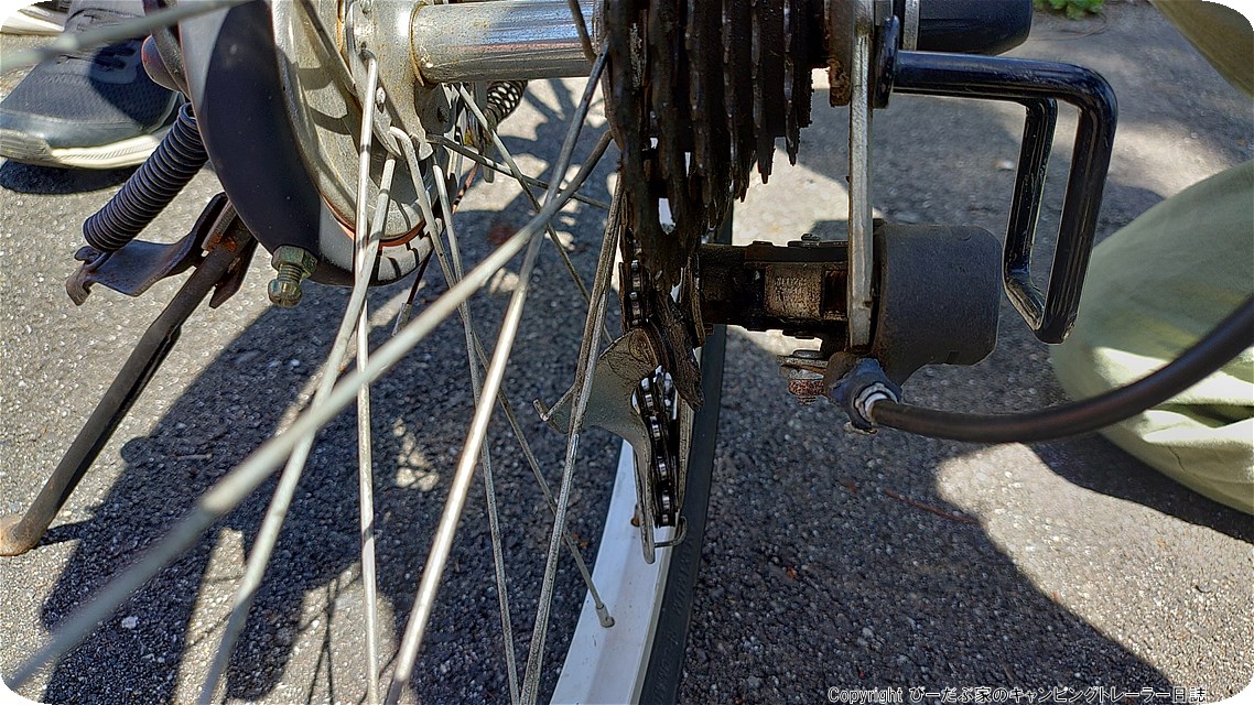 ちょっと判りづらいですが、ディレイラーがスポークと接触してグチャグチャに変形しています。そしてスポークも折れてる…。更にはチェーンも強固に噛み込んでしまい後輪が回らない状態。