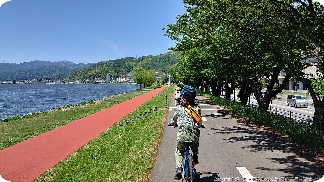 初めて長いサイクリングをしましたが、諏訪湖のサイクリングロード沿いには何カ所か公園、トイレ、休憩所、自動販売機、無料の足湯なども充実しているので小さいお子様連れでもかなり楽しめると思います!