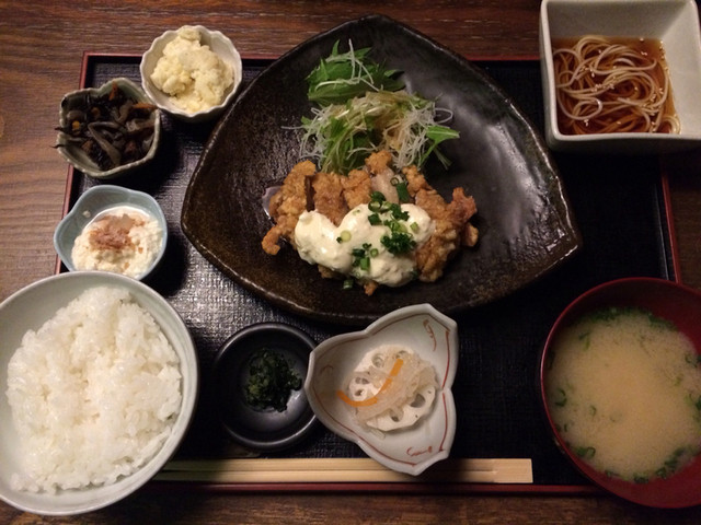 汉堡排套餐(1,100日元) 我在午餐时光临。走上二楼的楼梯后,店员在门口等候并打开了门。进入店内后,礼貌地带我去吧台座位。 午餐菜单有每日特餐、汉堡排、生鱼片、唐扬和牛排的各...查看详情