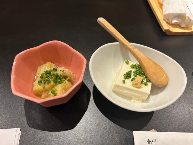 先ずは冷奴と茄子のお浸しの付け出しをつまみにビールで乾杯です。