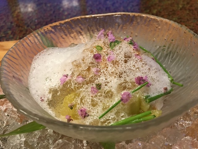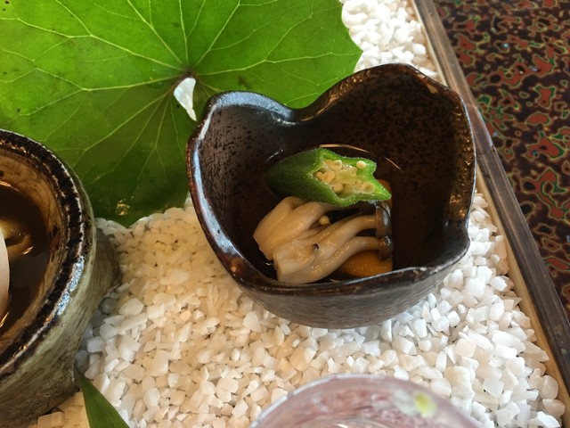 本日は“涼風一陣”と言うことで、風鈴で高みを作った涼しげな鉢ものの先付でスタートです。