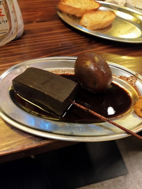 豆腐やこんにゃく、卵など、赤味噌で煮込んでまっ黒になっている、味は以外にあっさりです