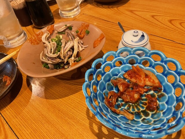 ・안주 오이 ・식초 모츠 또는 모래 간장 소스 ・특제 감자 샐러드 ・국산 와규 심장 구이 ・명물 하카타 한입 만두 ・물 만두 ・하카타 멘타이 새우 만두 ・자랑하는 돼지고기 김치 ・특제 오코노미야키(돼지살)