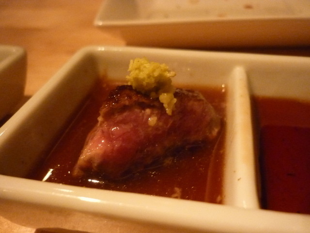 美味しいお肉食べたくて、サクッと検索して当日開店間近に電話予約。通路の先のエレベーターで2階へ!気さくな感じの店主?さんが出迎え頂きました。メニューもありますが、基本的にはお任せのお店とのことなので、要望を伝えおまかせで!チーズ、生ハムで前菜。サラダ、A5炙りユッケ、など頼み、メインは肉のフィレとロース?二種のステーキで!国産のフィレとロース?とのこと。B.M.Sはあまり高くないかな?味は塩、ボン...