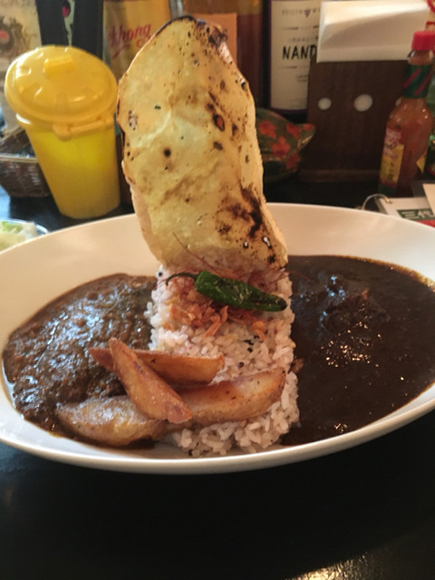激辛黒カレー、キーマカレー(辛)、レンズ豆と野菜(辛)、ひよこ豆(甘)と本日のスペシャルバターチキンカレー(甘口)から2種類選んであいがけになる。