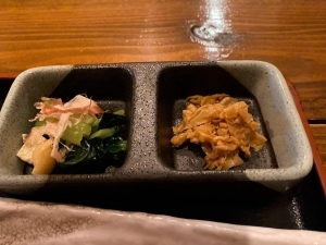 七輪で炙るメニューは約27種 付け出しに日本酒+鮭とばなどの珍味を七輪でいただきました。