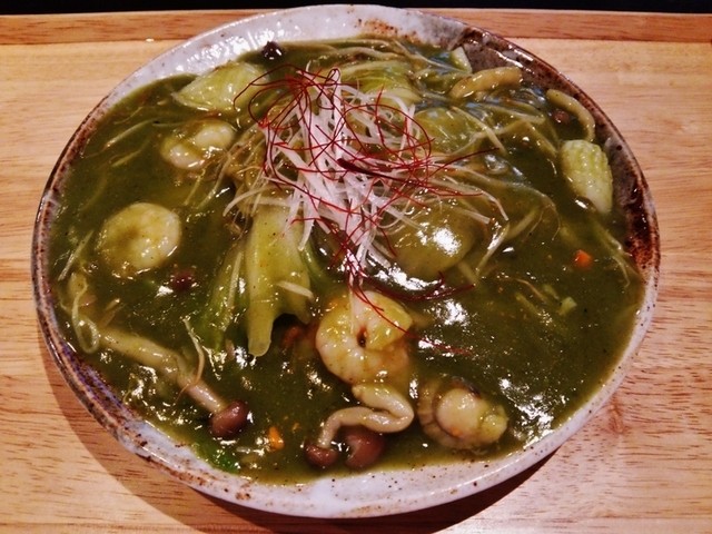 あんの具材は、抹茶、海老、イカ、ホタテ、しめじ、白菜など!!パリッと焼き焦げのついた麺の上に、海鮮と抹茶たっぷりの塩ベースのあんかけ焼きそば~♪(^o^)丿