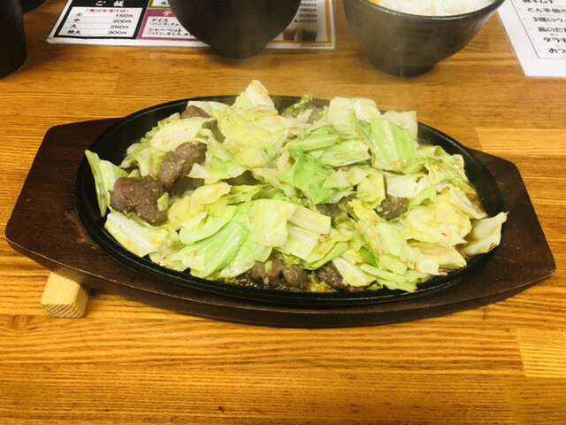 豚のカシラ肉とキャベツをニンニクたっぷりで炒めて