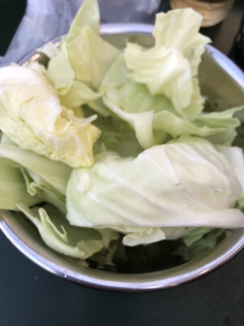 まずは、生ビールの中と、串カツ三種そしてホルモン炒めを注文しました。すぐに生ビールとお通しのキャベツがやってきました。キャベツはお代わり自由だそうです。