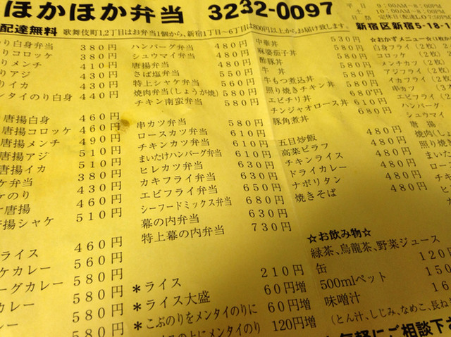 新宿三丁目駅E1出口を地上に上がり、明治通りを東新宿駅方面に進んだところにあるお弁当屋さん。「ほかほか弁当」という店名ですが、一般名詞のようでもあり識別しにくいですね。それでも近隣では重宝されている存...