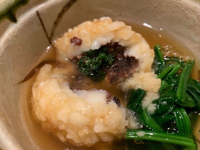 ④「北海道ゆり根のお万頭、十六穀米を包んで」…お万頭の外側がカリカリ食感、中は百合根がとろりとしていてそのバランスまで美味しい。出汁は生姜がアクセントになり、さらに中には十六穀米、ブロッコリーが入っていて全体に楽しめる一品。