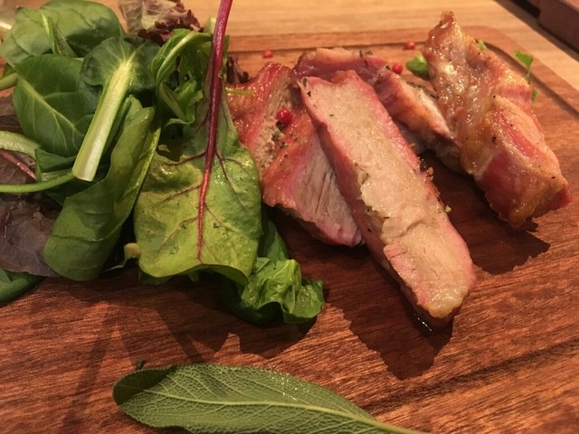 どんな特徴があるのか伺うと、交配した四種の内に黒豚血統を含んでおり、適度な脂と赤身のバランスが良く食感・味が楽しめるとの事。