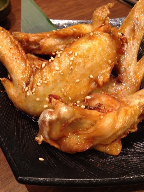 ・博多地鶏の叩き 鳥を生食しない私にとっては珍しい料理。鳥の下に敷いてある玉ねぎのスライスを包んで、ポン酢に付けて食べました。焼いた方が好みだったので、鳥の手羽揚げも注文。一味をかけて食べると一段と旨味がひきたちます(*^^*)
