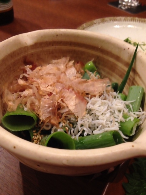 ・鳥のなめろう 初挑戦!博多地鳥と味噌と薬味を刻み合わせたもので、しょっぱ〜い。ご飯とも合わないし、やっぱり日本酒と合わせるべきかな。