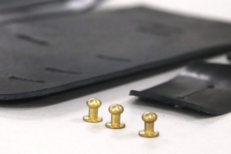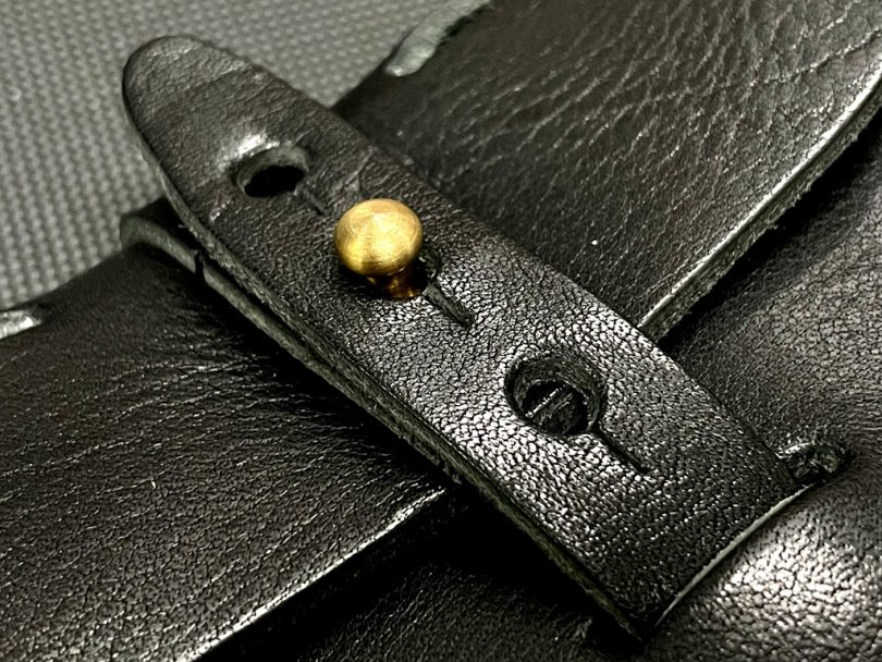 開閉部は、尾錠を使えば開け閉めがしにくくなり、マグネットを使えばコストが上がる、という問題点から「ギボシ」を採用。素材は真鍮を使うことで高級感より、クラッシック感やワイルドさを表現しています。