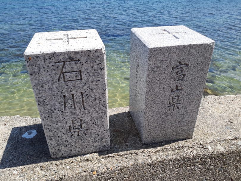 堤防の上にある石川県と富山県の県境標