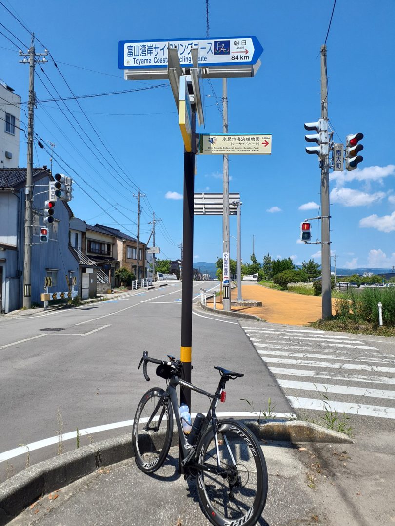 この富山湾岸サイクリングコースは基本的に一本道。氷見市側から走るか朝日町側から走るかだが、なんとなく氷見側からにしようと決めていた。どっちが起点とか終点とかないらしいんだけど、自分のなかのイメージだ。左側通行で湾を左手に見て走る。T字路でも道が交差しないので安全だというのもある(同様の理由で島は時計回り、湖は反時計回りが基本だとされている)。