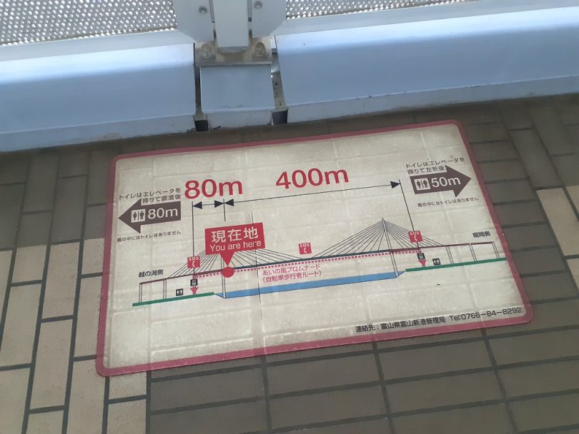 じつはこの橋ではなく、橋ができるまで主要な交通手段だった渡船(自転車は無料)で富山新港を渡ったほうが雰囲気があっていいんだけどコースはこちら。このプロムナードへはエレベーターで上がるのだが、このあいの風プロムナードは正式な富山湾岸サイクリングコースのルート。つまりここはナショナルサイクルルート唯一の、いや世界唯一の(日本矢羽根研究所調べ)エレベーター自転車道なのだ! それに気が付きいきなりテンションアップ。