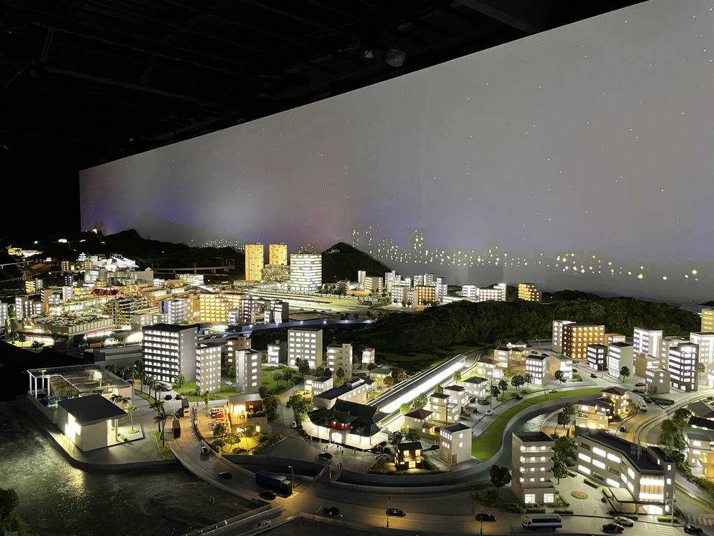 新宿から箱根までの景色が再現されていて、その中をロマンスカーや小田急線が走っています。