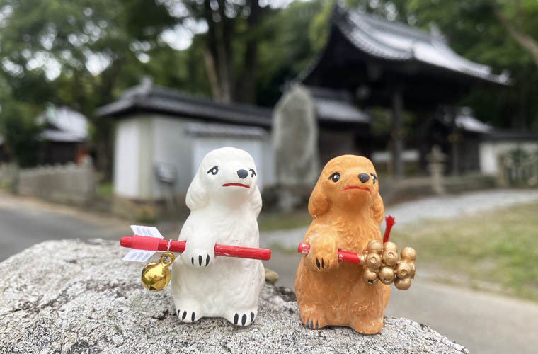 社務所では犬の無病息災や交通安全などを願うお守りや絵馬を授与しています。中でも珍しいのは陶器製の置き物で、中におみくじが入った『犬幸(けんこう)招きみくじ』。犬幸祈願の広報犬であるトイプードルの悠(ハル)と凛(リン)の2頭をイメージして作られたもので、それぞれが手に破魔矢と鈴を持っています。最近、玉串を持ったタイプも新たに登場!