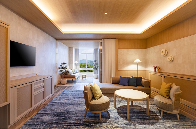 2025年7月にリニューアルした温泉半露天風呂付きのプレミアムルームは、瀬戸の山々を切り取るプライベート・テラスバスを新設。窓の外に広がる開放的な山並みを眺めながら、至福のひとときを過ごせます。