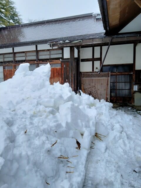 曲が家のL字の屈曲部に玄関なんか作っちまってるから、そこは雪崩の巣になってるのさ。この先どんどん積み重なるから、落ちた傍から山を削る。
