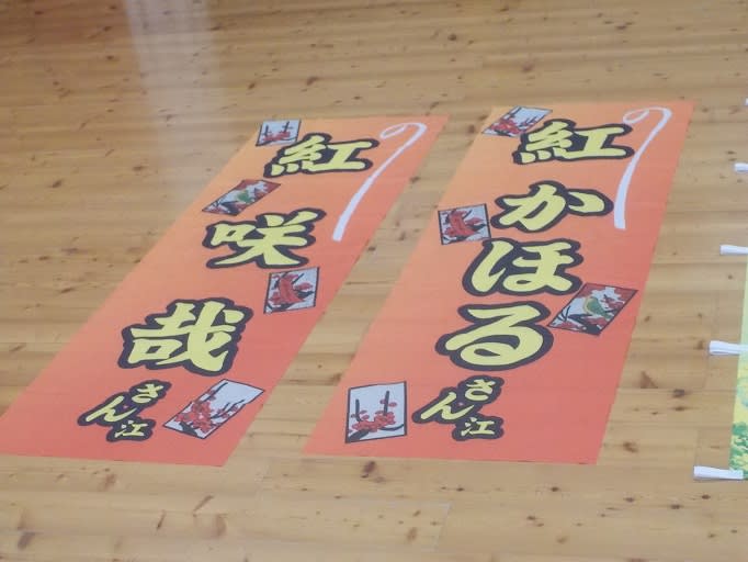大衆演劇って言ったら、幟旗だよ。小屋の前に立ち並ぶ幟の数々、盛り上がるねぇ、お祭り気分。芝居見物は晴れの日、祝祭だから、にぎにぎしくお客さんを迎えようってことだ。屋根にも届く大きな幟が何本もはためいて、っと行きたいところだが、貧乏劇団の菜の花座、それもたった1度の公演に大枚はたけるわけがないだろ。幟でさえ制作はいい顔しなかったくらいだ。でも、なんとかそれらしい飾りつけはしたいよね、ってことで、作った!幟旗!!