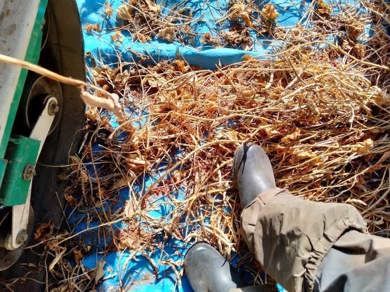 これで莢にダメージを与えたら、株元を掴んで、シートの上に何度も叩きつける。さしもの執着深き小豆も莢の懐から転がり出る。