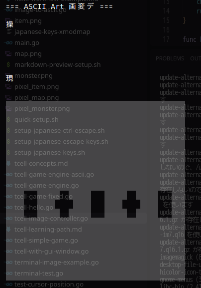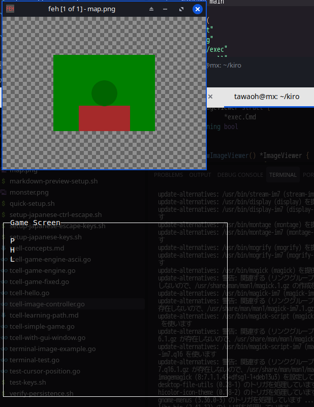1つ目はターミナルというかTcellからビューワを呼び出して、任意でそのビューワを閉じるというもの。僕の敵グラフィックとかをビットマップで表示できたらなぁ?という質問に対してのもの(CLIに画像を表示できるRacketはマジで異端ですねw)。