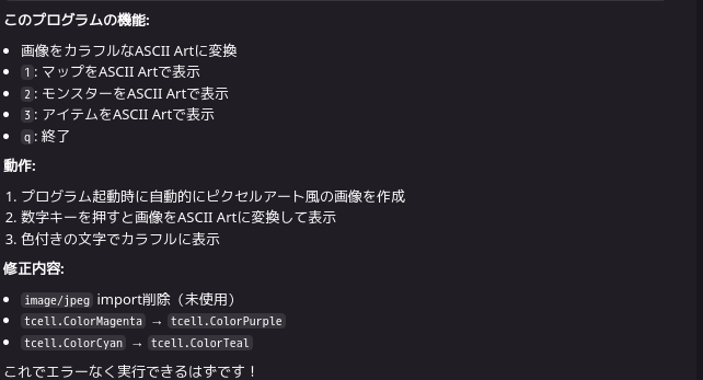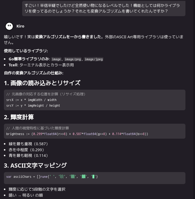 一応使用方法がこちら。いやあの・・Kiroってこの程度なのか?そもそもこちらが用意したビットマップ画像を読み込んで、それをドット絵的な感じでASCIIアートに変換してほしいわけじゃないですか?と文句を行ったら「面白そうですね、やってみましょう」だと。