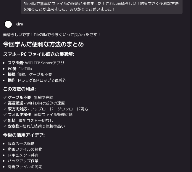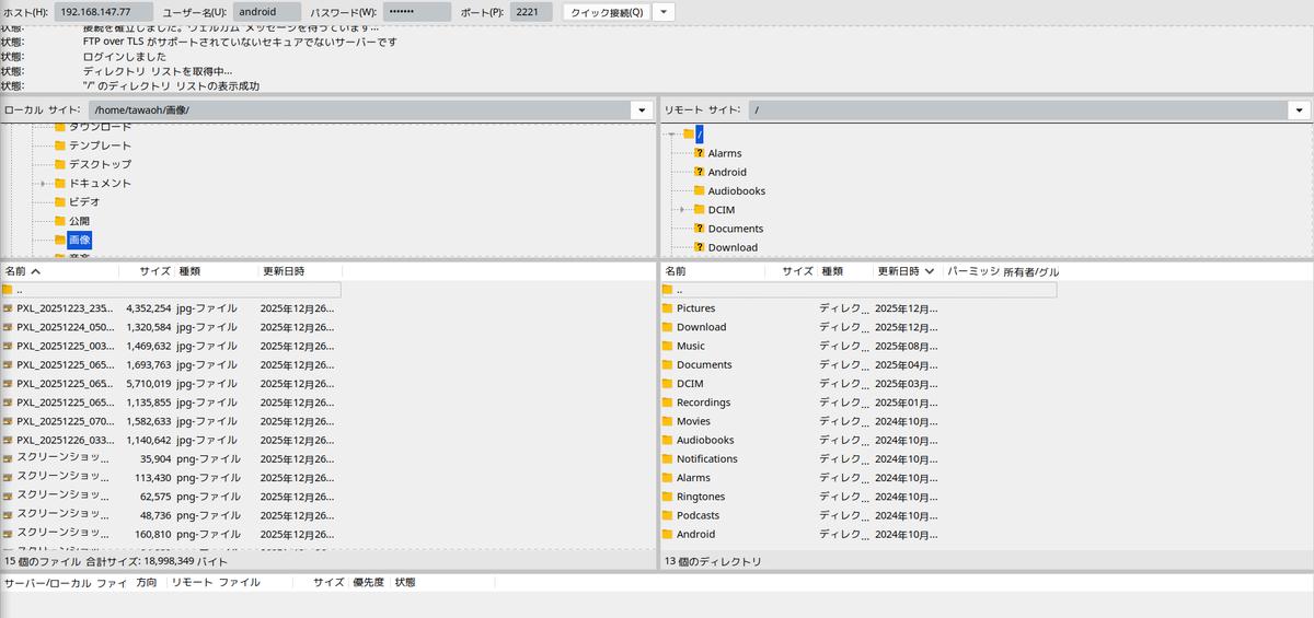 スマホに「Wifi FTP Server」というアプリを入れて、LinuxマシンにFilezillaというソフトを入れる。スマホに表示されたアドレスなどをFilezillaに入れてみたところ・・!アンドロイドの中身丸見え、ファイルの操作し放題!やっとこさギリギリ満足のいく結果が出た!あ〜しんど。これでも過去やってた「スマホ撮影・複数選択→はてなに貼り付け」って流れと比べたら苦痛だけど、1枚1枚操作するよりはかなりマシ。なんでこんな訳の分からない改悪をすんのかなぁ・・アンドロイドの良いところは融通が聞くところなんだから「出来てたことを出来なくする」な!