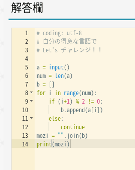これで文字列の奇数番目にある文字だけを抜き出して合体させるという問題をクリアして・・