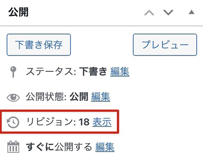 リビジョンが保存されるタイミングは、「下書きを保存」、「公開」、「更新」のいずれかを押したときです。※「更新」しても、変更が加えられていない限りリビジョンは作成されません。
