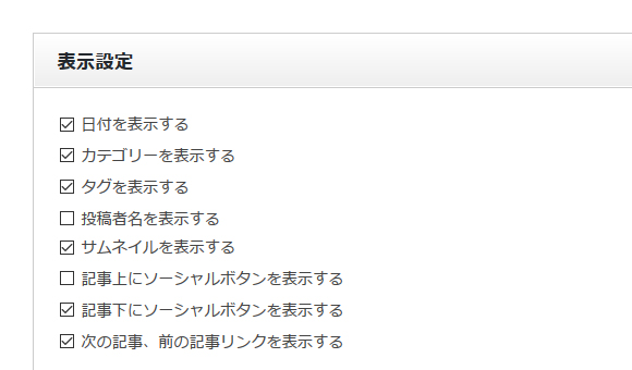 ページごとに日付、カテゴリー、サムネイル、タグ、投稿者名等の表示/非表示を細かく設定可能