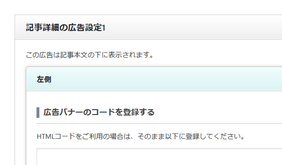 記事詳細ページに常時表示する広告を設定できるほか、ショートコードで挿入するタイプの広告の設定も用意