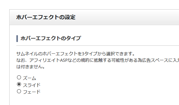 サイト内のサムネイル画像のホバーエフェクトは「ズーム」「スライド」「フェード」から選択可能