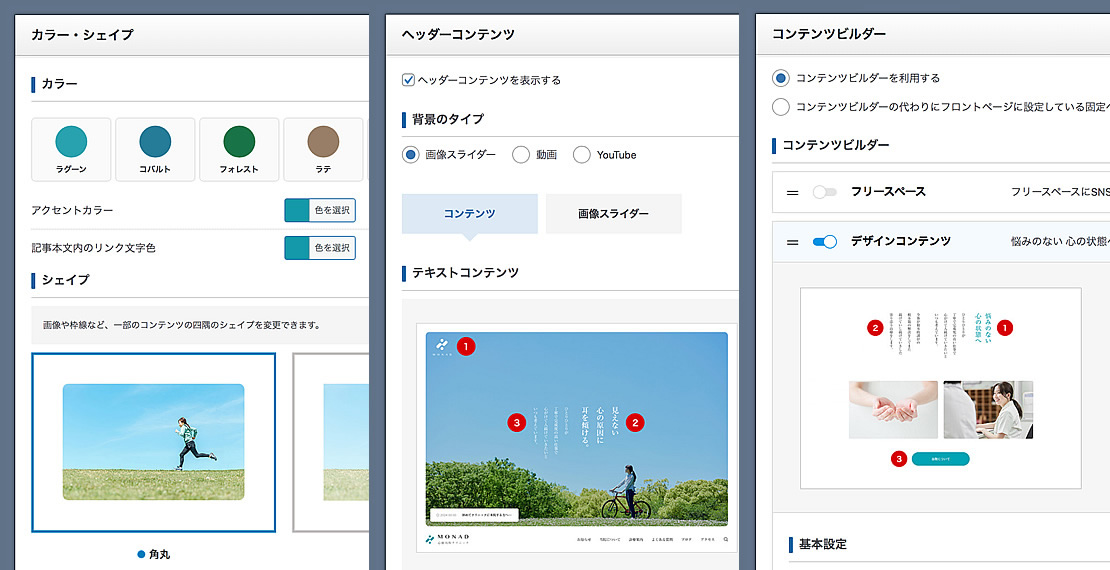 「MONAD」のトップページは、高いカスタマイズ性を有します。配置や各要素の改変・自由度も上がっており、あなた好みのホームページにカスタマイズできます。