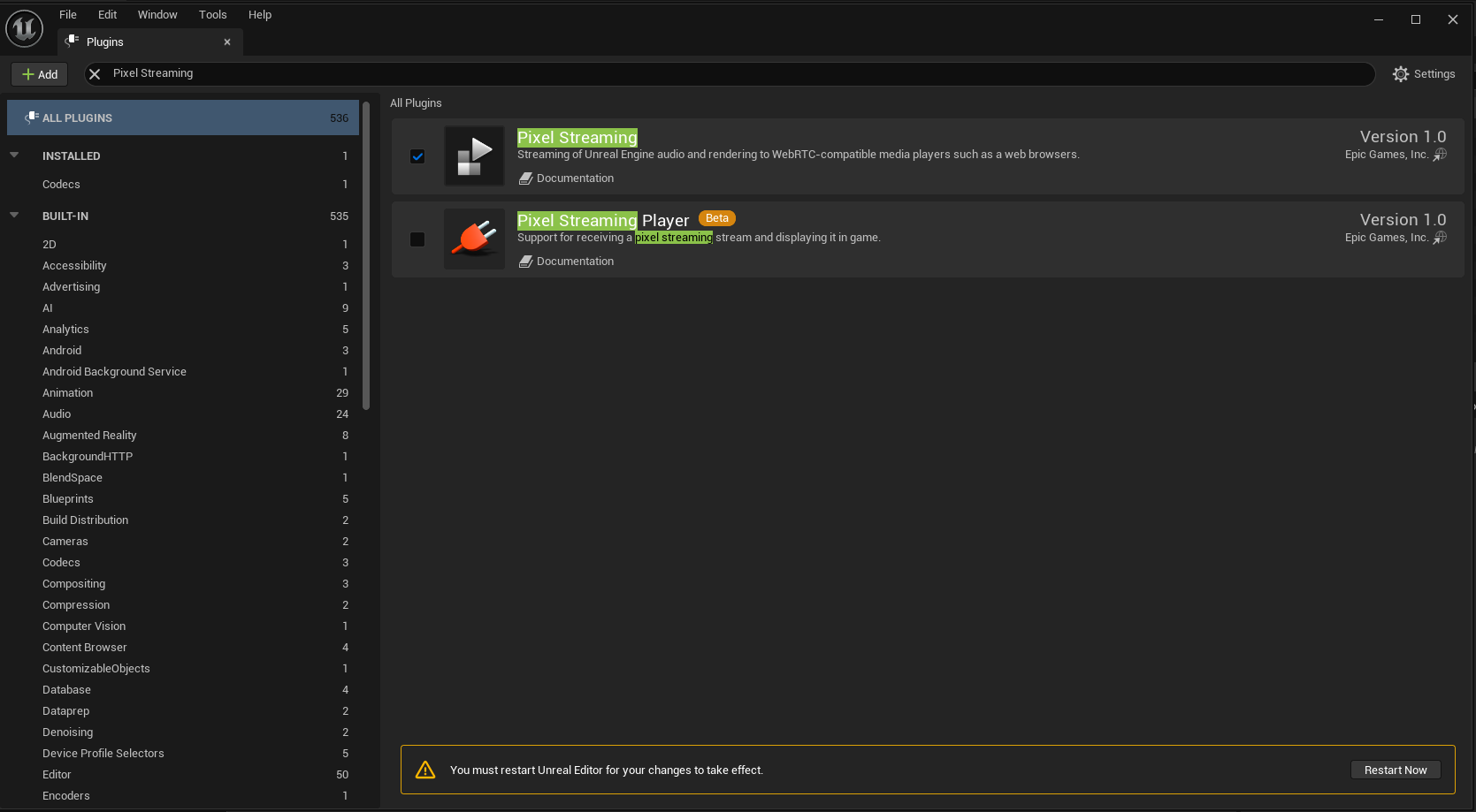 メニューバーから Edit ⇒ Plugins を選択し、検索ボックスに Pixel Streaming を入力します。