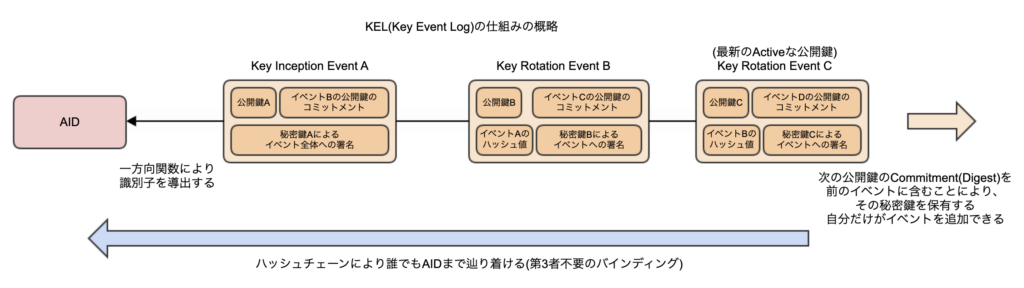 KELには鍵に関するイベントだけでなく、任意の外部イベントのダイジェストをイベントとしてアンカリングすることが可能です。本記事の試行においても、VCの発行および失効がイベントとしてKELにアンカリングされています。その目的は、AIDによって実行されたアクションを時系列で記録し、公開することで否認防止につなげたり、ある外部イベントに対してどの時点の公開鍵ペアで署名がなされたかを検証可能にすることなどが考えられます。 VerifierによるACDCの検証のためです。GLEIF公式のvLEIトレーニング用リポジトリにおける説明によれば、W3C VCDMやSD-JWT VCとは異なり、ACDCにはIssuerによる署名がついていません。Verifierは検証として、受領したACDCのDigestがTransaction EventとしてIssuerのKELにアンカリング、すなわちハッシュチェーンの中の1つの要素として正当に追加されていることを確認します。要素であるTransaction Eventは直前でActiveな公開鍵ペアの秘密鍵により署名されており、Verifierはどの公開鍵で検証すればよいかも判別できます。 (2025/7追記)