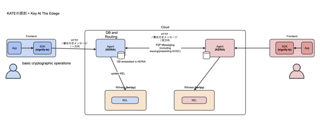 KERIにはKATE(Key At The Edge)という方針があり、暗号処理(Cryptographic Operation)はフロントエンド側で行い、バックエンドのエージェントは鍵やデータの保管、メッセージのルーティングを担う構成になっていると理解しています。