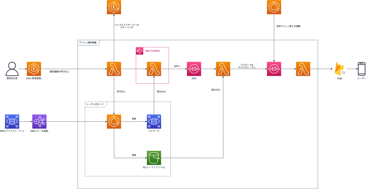 - RDBやS3から送信先デバイスのトークンを取得し, FCM (Firebase Cloud Messaging) 経由で通知を送る