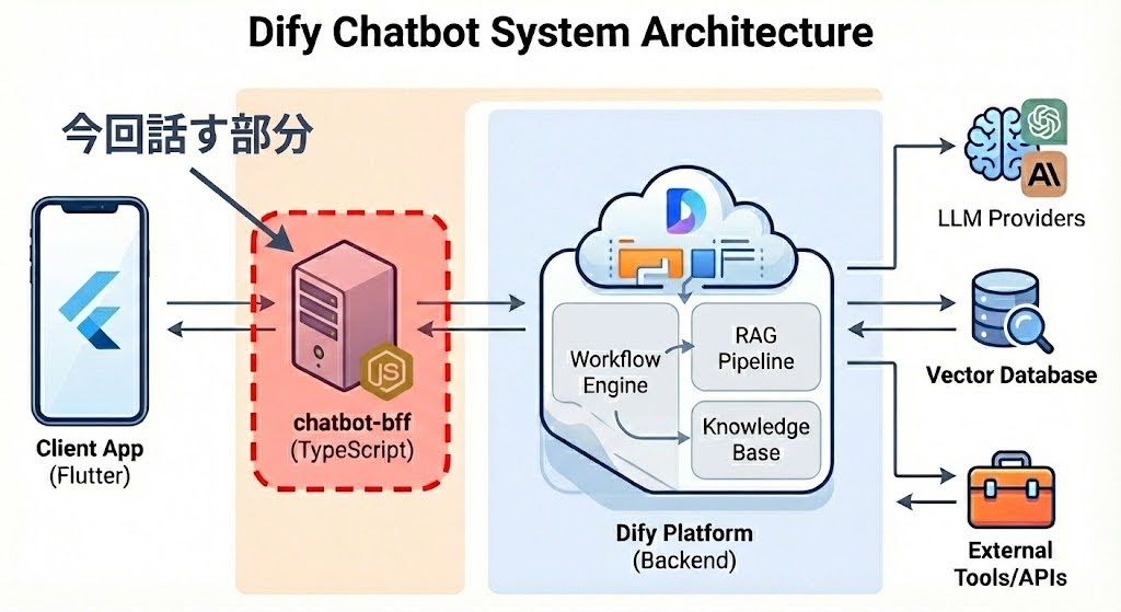 なぜBFFが必要だったかというと、Difyは初期フェーズとしてSaaS版を利用しているためです。ユーザーの入力をそのまま信用して渡してしまうと、個人情報が漏洩するリスクがあります。そのため、BFFを挟んでフィルタリングを行う構成を採用しました。
