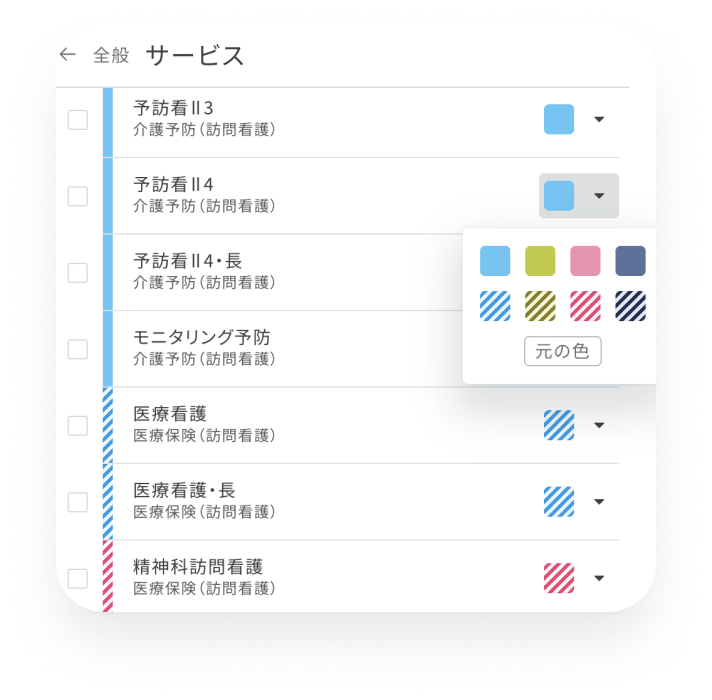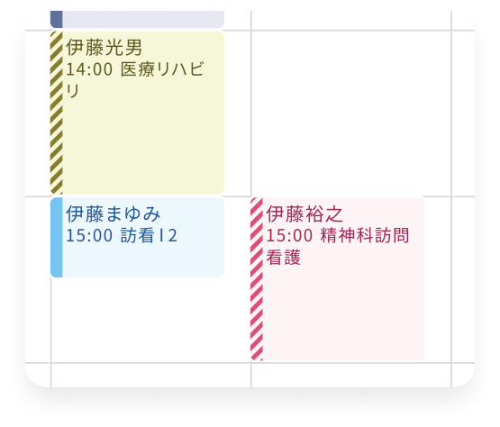 具体的には、予定カードの配色は、サービスカテゴリ(訪看、リハビリなど)ごとに分類していますが、この色数を現在は4色にしています。