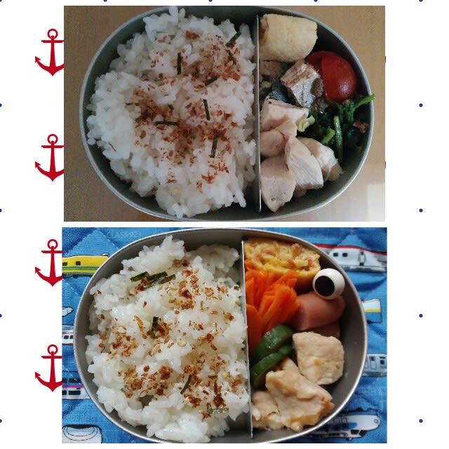 ②ふりかけご飯、桜えびの卵焼き、にんじんラペ、ウインナー、きゅうり、唐揚げ、別途バナナ