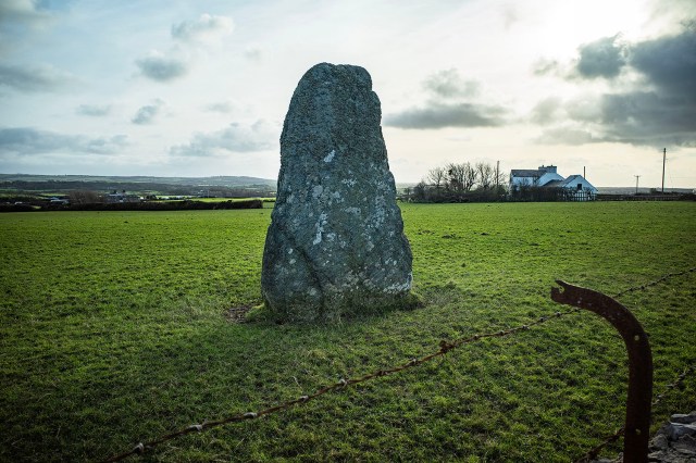 The King Stone is a single standing stone that was erected during the Bronze Age. Its strange shape has been sculpted by superstition, centuries of people chipping off bits of stone to carry as amulets, . Close to the King Stone are the remains of a Bronze Age round barrow. The only visible remnant of the 17m mound are a few loose stones and one large stone that is thought to be the capstone of the barrow’s chamber.