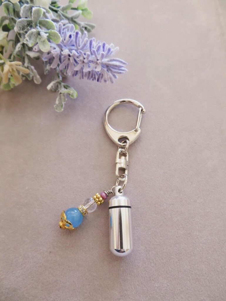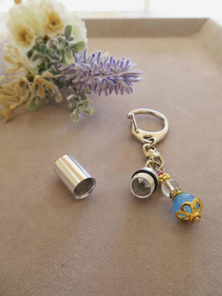 遺骨カプセルとは、ご遺骨を分骨して納めることができるキーホルダー型のカプセルです。遺髪や遺毛、思い出の品などを少量納めることも可能です。
