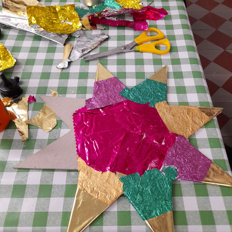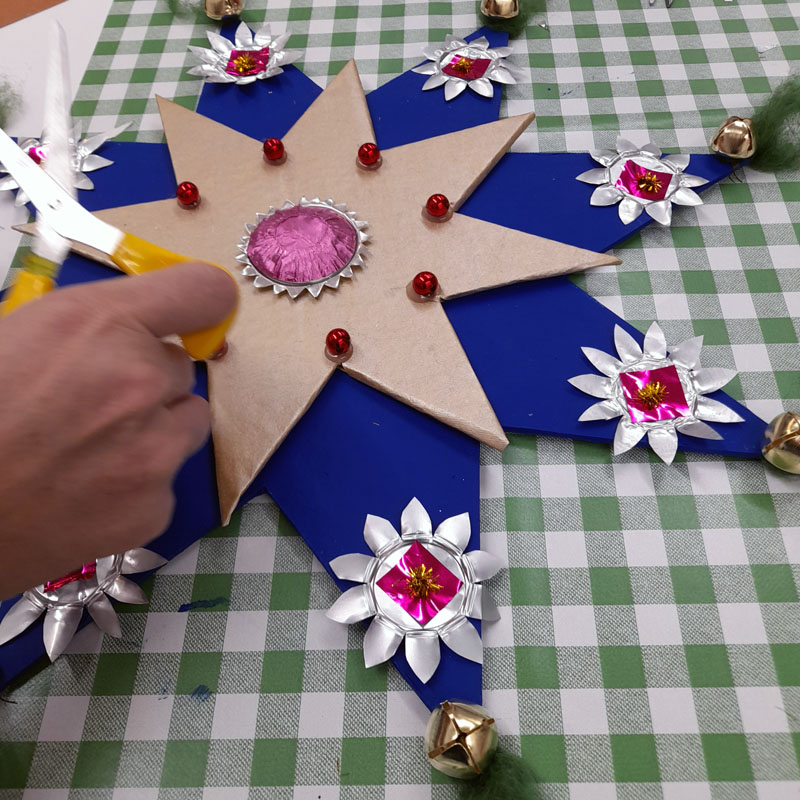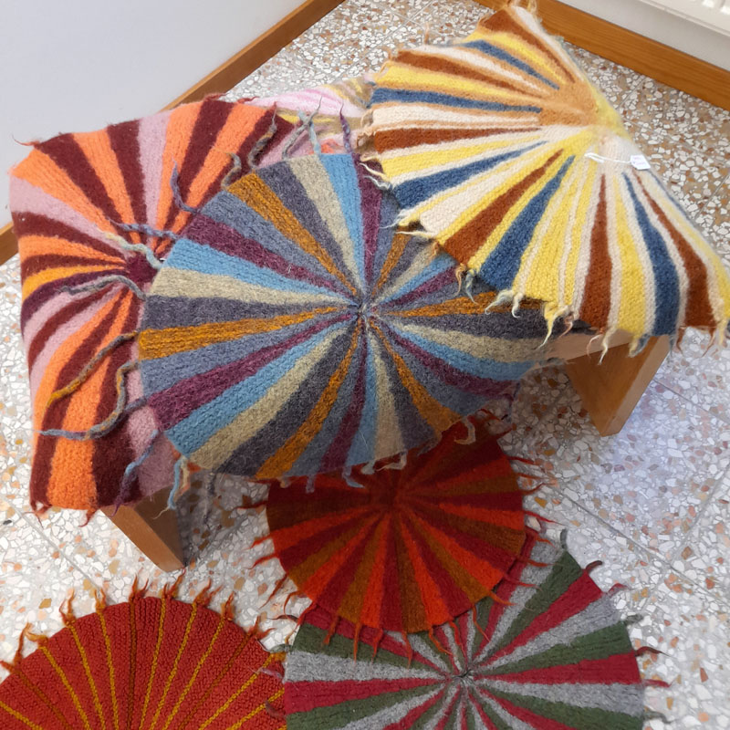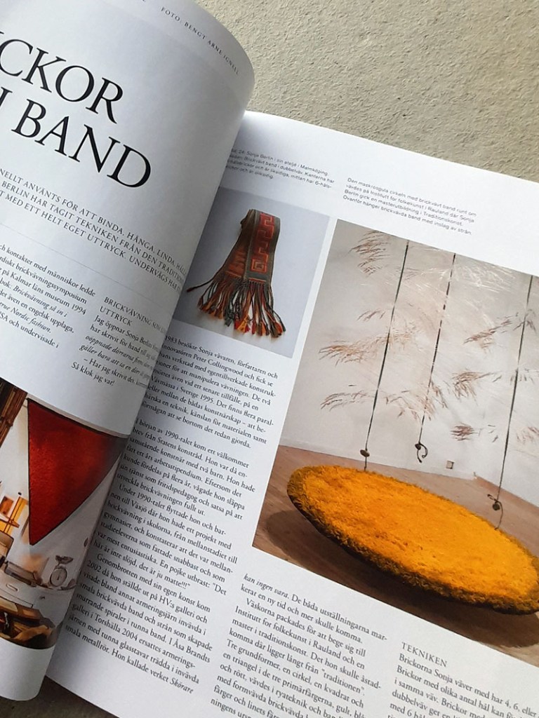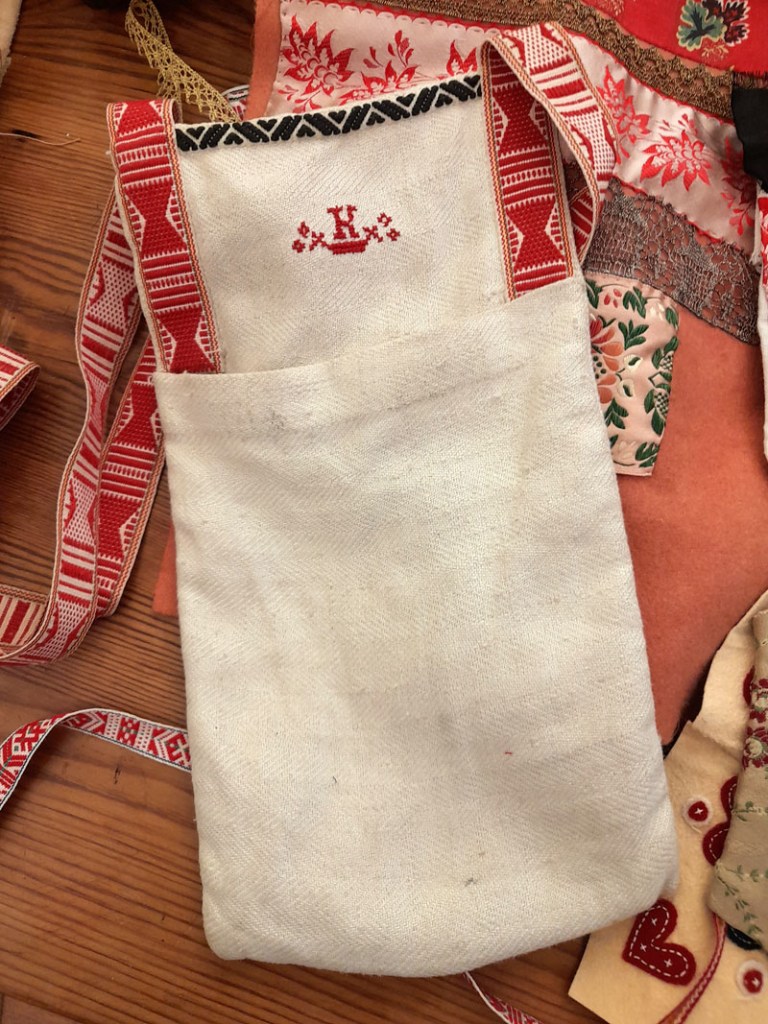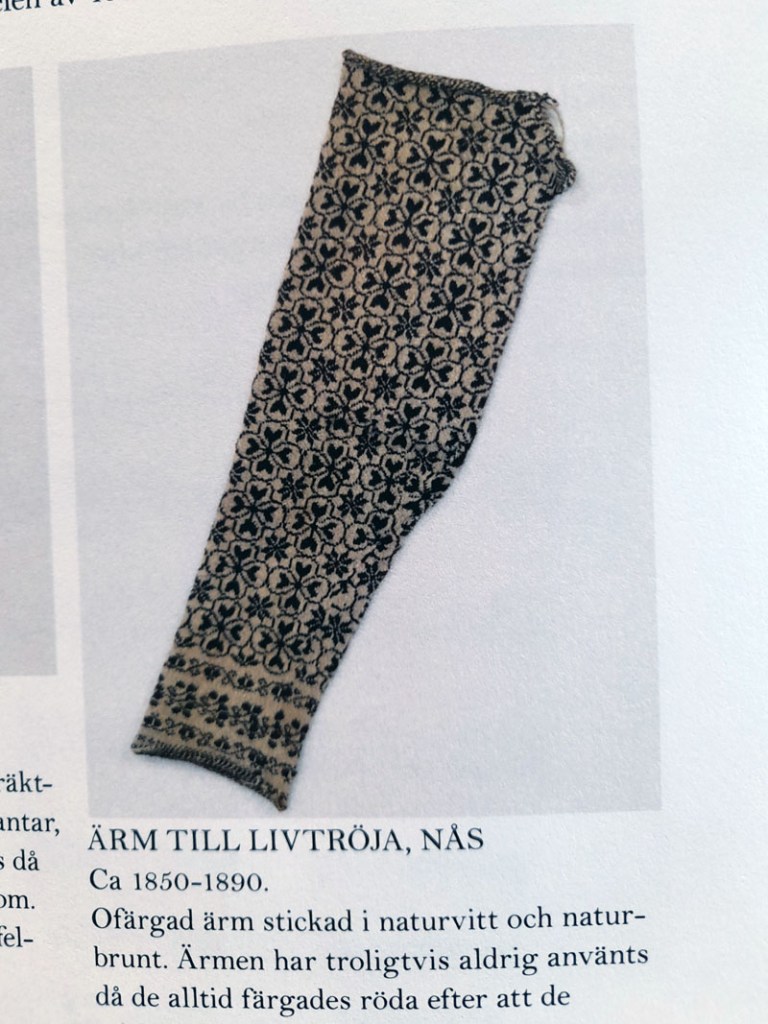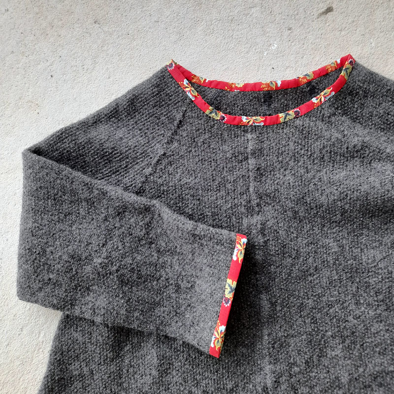 Tunikan från Yllet minns jag inte när jag köpte, men det var länge sedan. Efter några år och flitig användning började maskorna tänjas ut och stickningen tappade formen. För kanske tio år sedan försökte jag råda bot mot detta, chansade och tvättade tunikan lite för varmt i maskin. Ullfibrerna filtade ihop sig ungefär som förväntat. Men sömmarna i syntetmaterial krympte inte och det medförde att alla kanter blev buckliga. Efter workshopen med Karin Sterner vågade jag äntligen sätta saxen i plagget. Min plan var att sticka nya kanter. Men jag kom på andra tankar och halsringning och ärmavslut är istället kantande med kattun. Jag minskade också tunikans längd med 6 cm och nu är det mer en tröja än en tunika. Det blev så bra och jag är så nöjd!