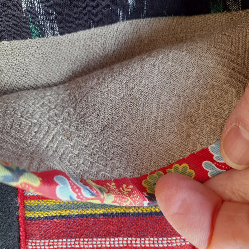 Koftan av märket Masai på första bilden köpte jag någon gång i slutet av 1990-talet. Den var från början riktigt vid och det trivdes jag med när den var ny. Men senare kom jag inte helt överens med allt överflödigt material. Koftan har överlevt flera garderobsrensningar och har legat undanstoppad i väntan på en förbättring. Nu har jag tagit tag i saken. Omkretsen på livet har minskats med ca 40 cm och jag har en bekväm och användbar kofta.